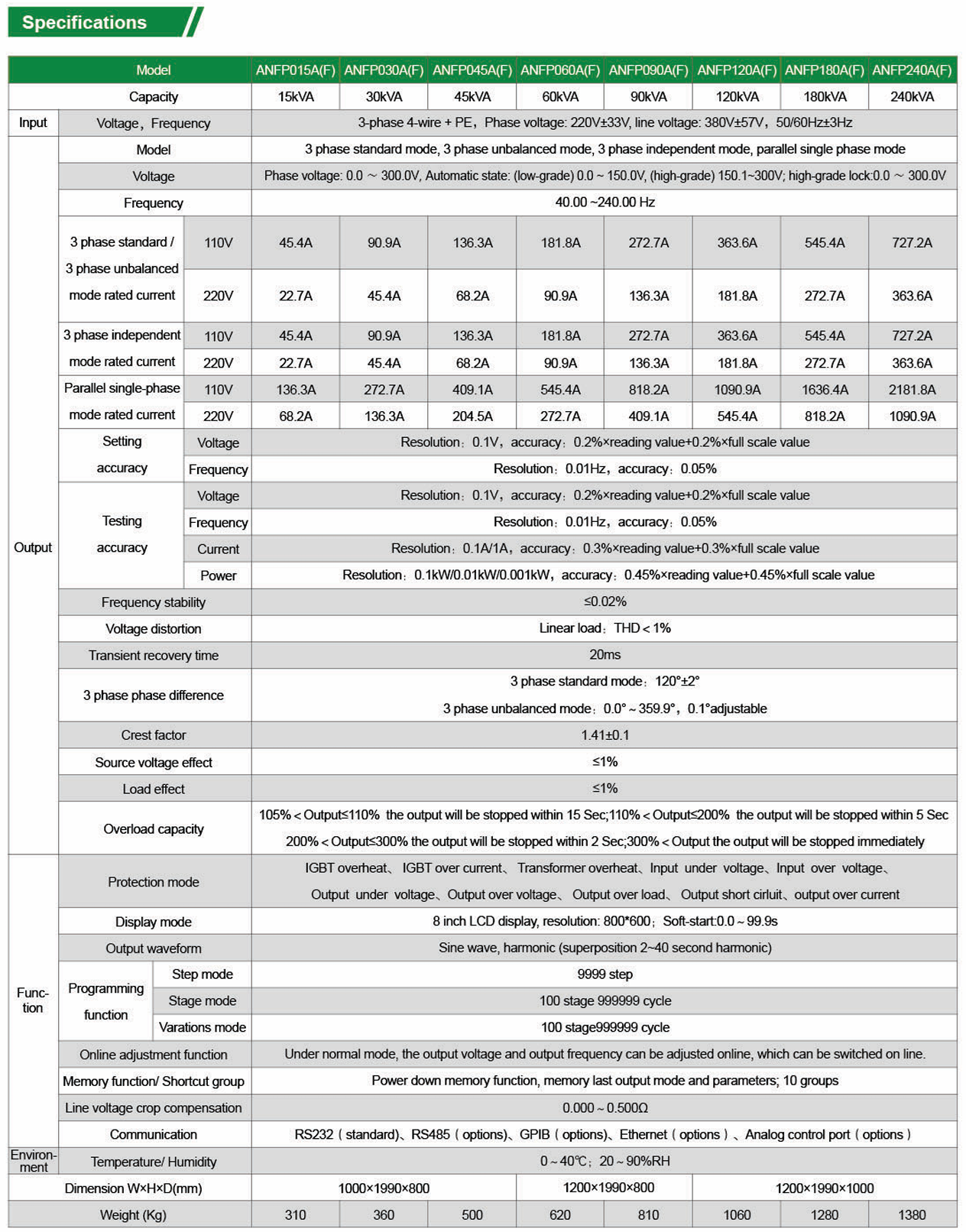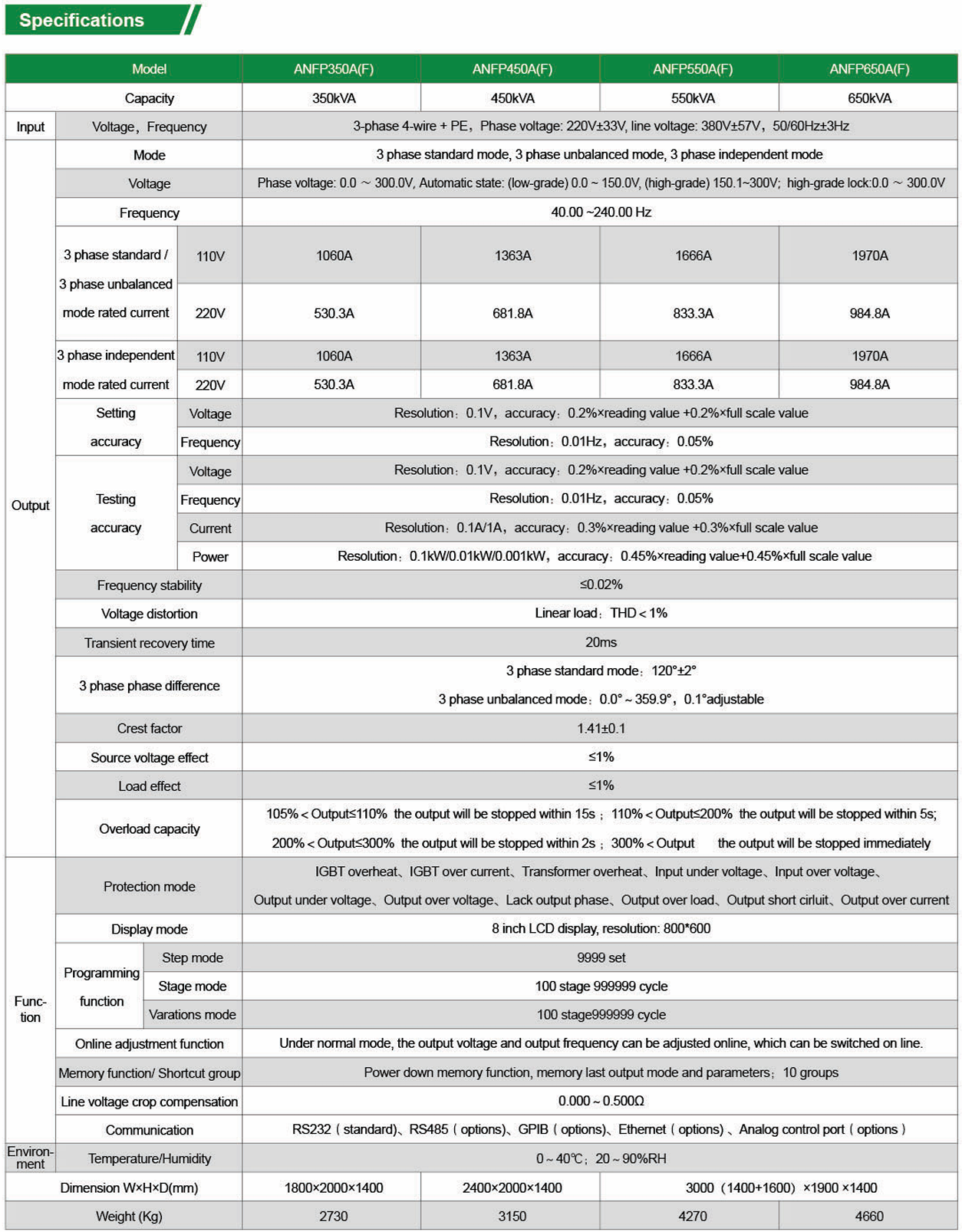 ANFP Series AC 전원 공급 장치는 FPGA 디지털 제어, 순간 파형 제어 및 고주파 펄스폭 변조(SPWM) 기술을 채택하여 빠른 응답 속도, 높은 출력 정확도 및 우수한 파형 품질의 이점을 제공하며, 정격 전류 영향의 3배를 견딜 수 있습니다.